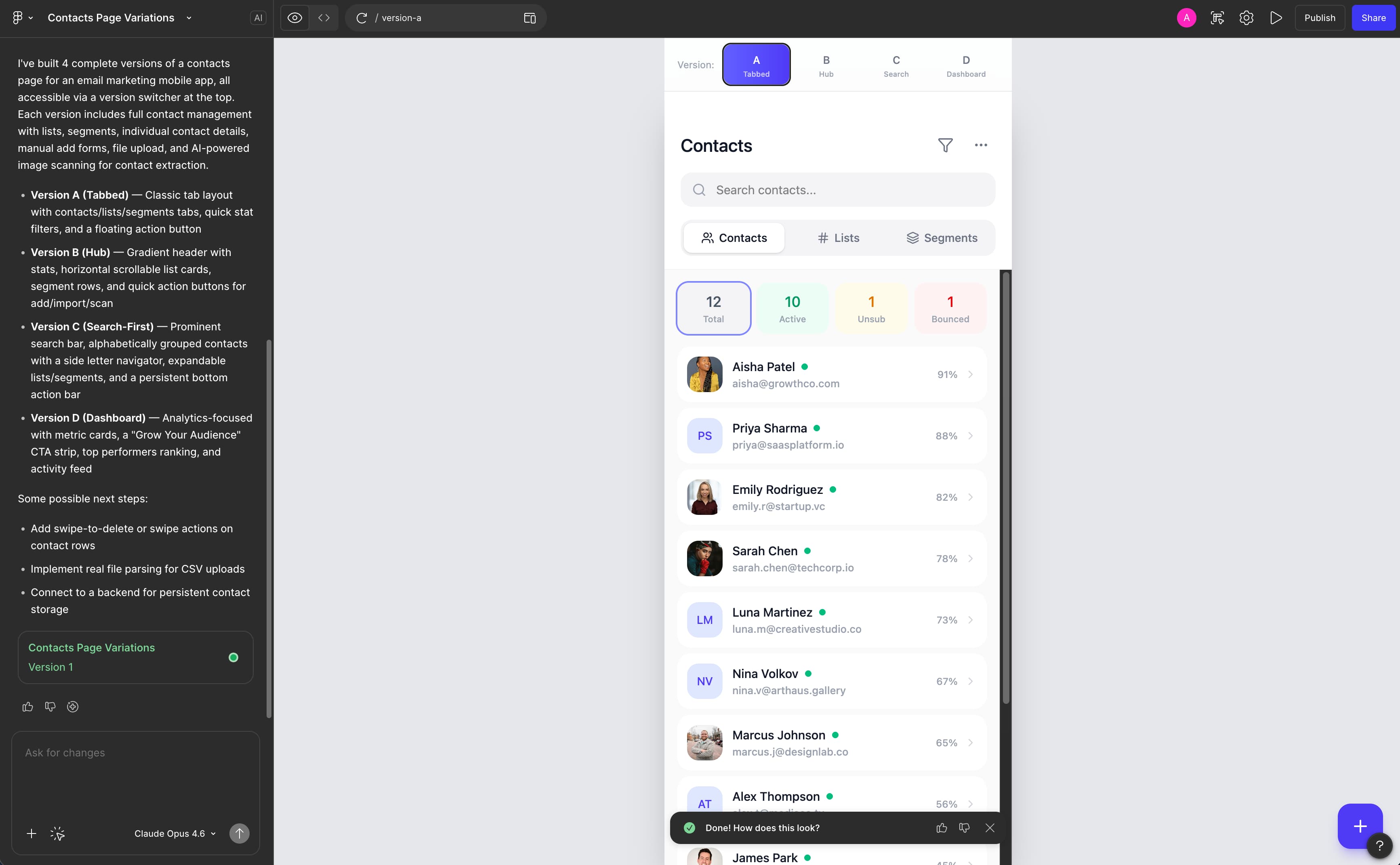 The email section transformed based on journey stage: first-time visitor, draft creation, performance dashboard. One surface, three modes.