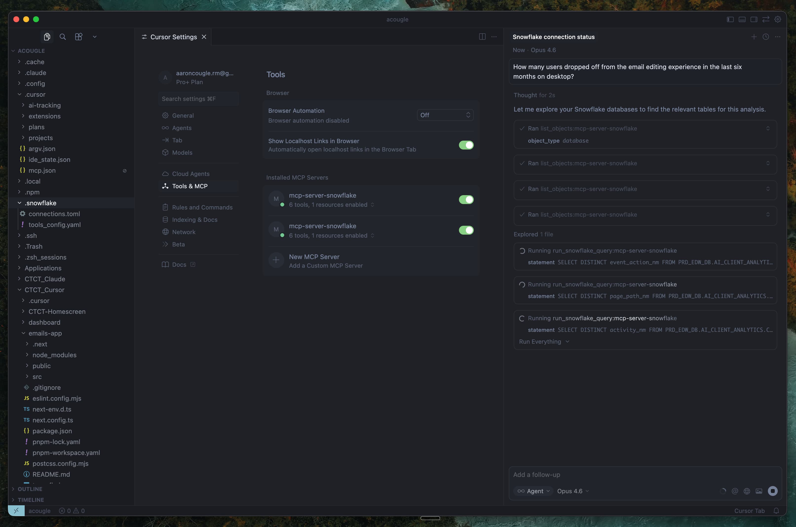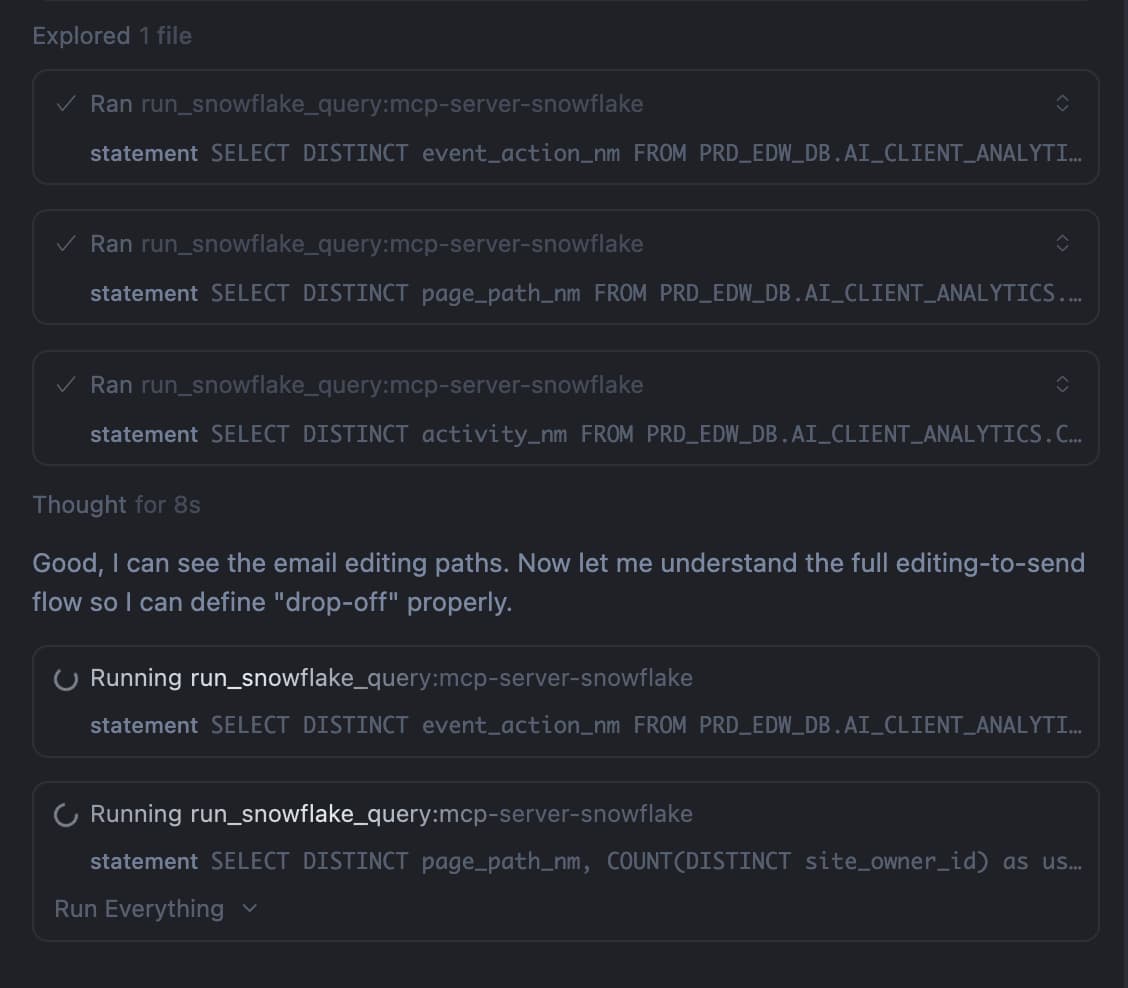 I connect Cursor to Snowflake through an API to explore, query, and understand user behavior data, making design decisions based on raw usage patterns rather than waiting on data pulls.